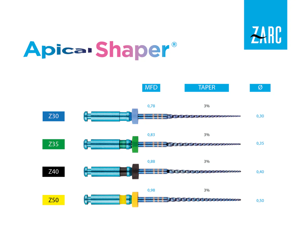 Apical Shaper është një instrument formësimi apical me vetëm një konikim prej 3% për të ruajtur më mirë dendinën pericervikale.Aliazhi blu siguron fleksibilitet dhe rezistencë maksimale ndaj lodhjes ciklike.Seksioni tërthor paralelogram i qëndruar siguron performancë të shkëlqyer prerje dhe fleksibilitet të madh.I pajtueshëm me të gjitha sistemet e formësimit të kanalit rrënjor.